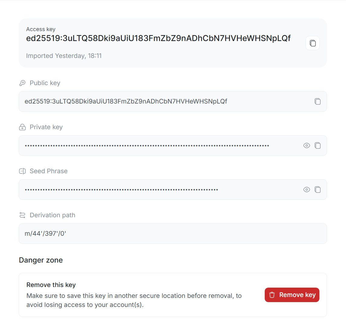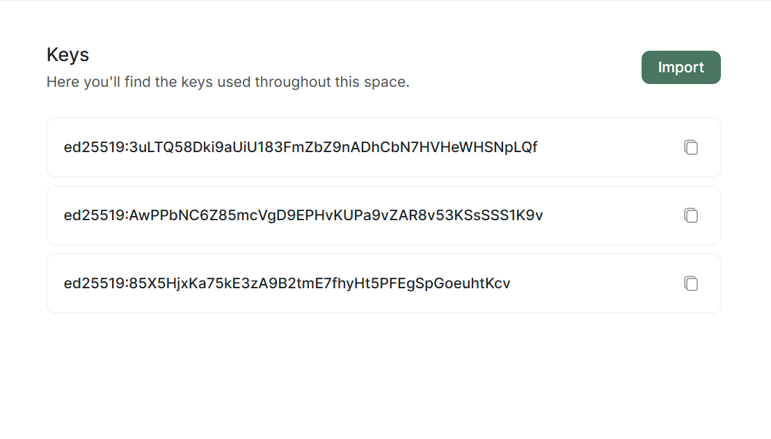 Upon entering section, you will see list of all keys you have already imported into this network.