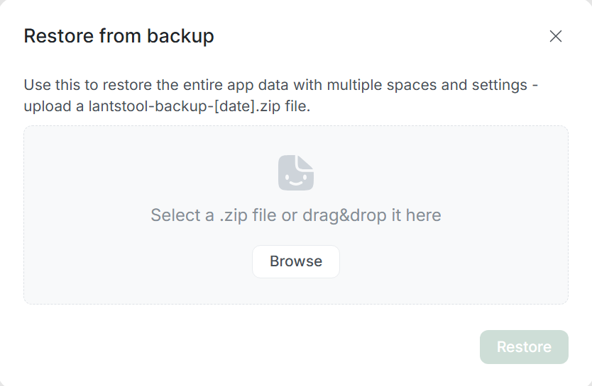To restore data, use Restore Backup function on Get started welcome screen. After selecting corresponding file, Lantstool will automatically restore all your spaces, networks, keys, and other data, allowing to continue work immediately.